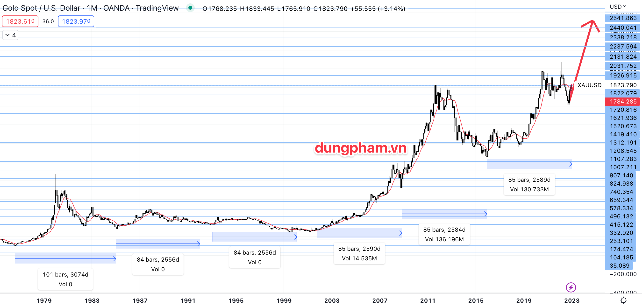 Như vậy trừ chu kỳ xa nhất 1976-85 dài hơn 85 tháng, 5/6 chu kỳ còn lại đều kéo dài khoảng 8 năm và 2023 rất có thể là nhịp khởi đầu của một chu kỳ vàng mới kéo dài đến 2030-2031.