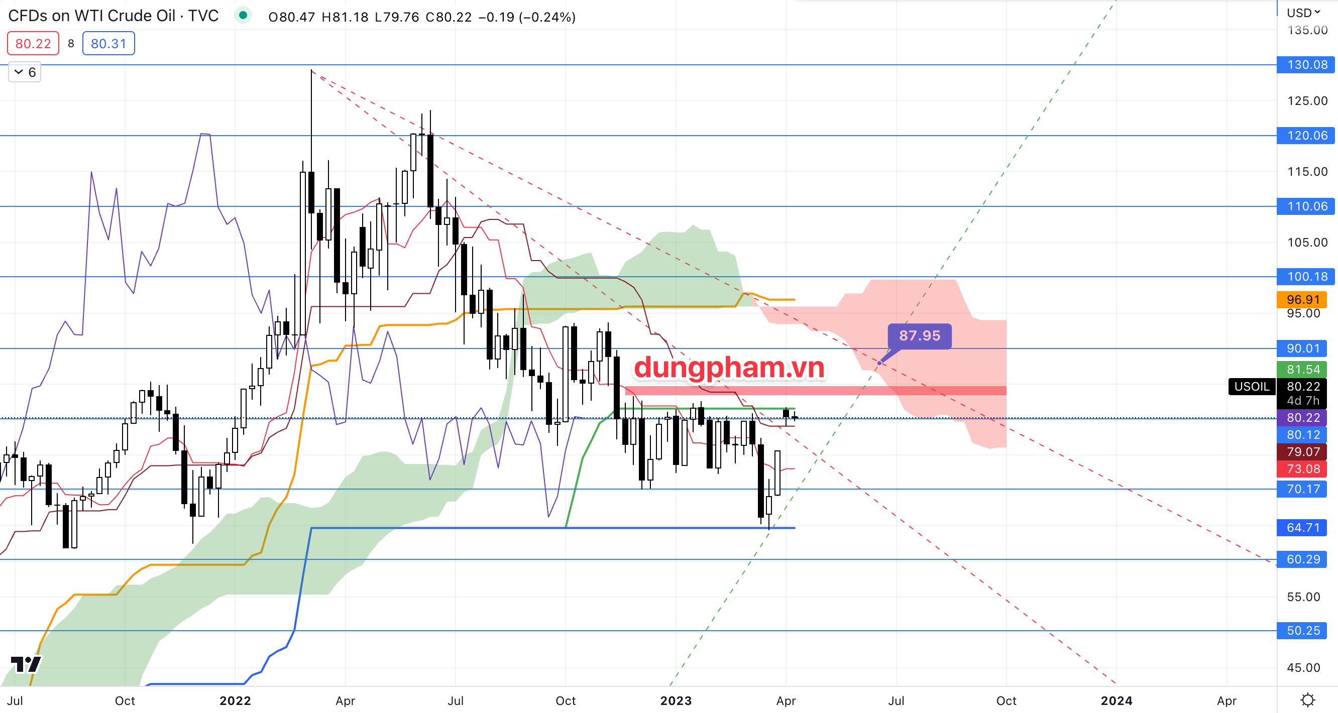 Vừa rồi Dầu có đoạn tích luỹ dài 4 tháng, từ T11/2022 đến hết T3/2023 trong biên $70-80 với một nhịp rũ bỏ khi đập về $65 – ngưỡng hỗ trợ mạnh.