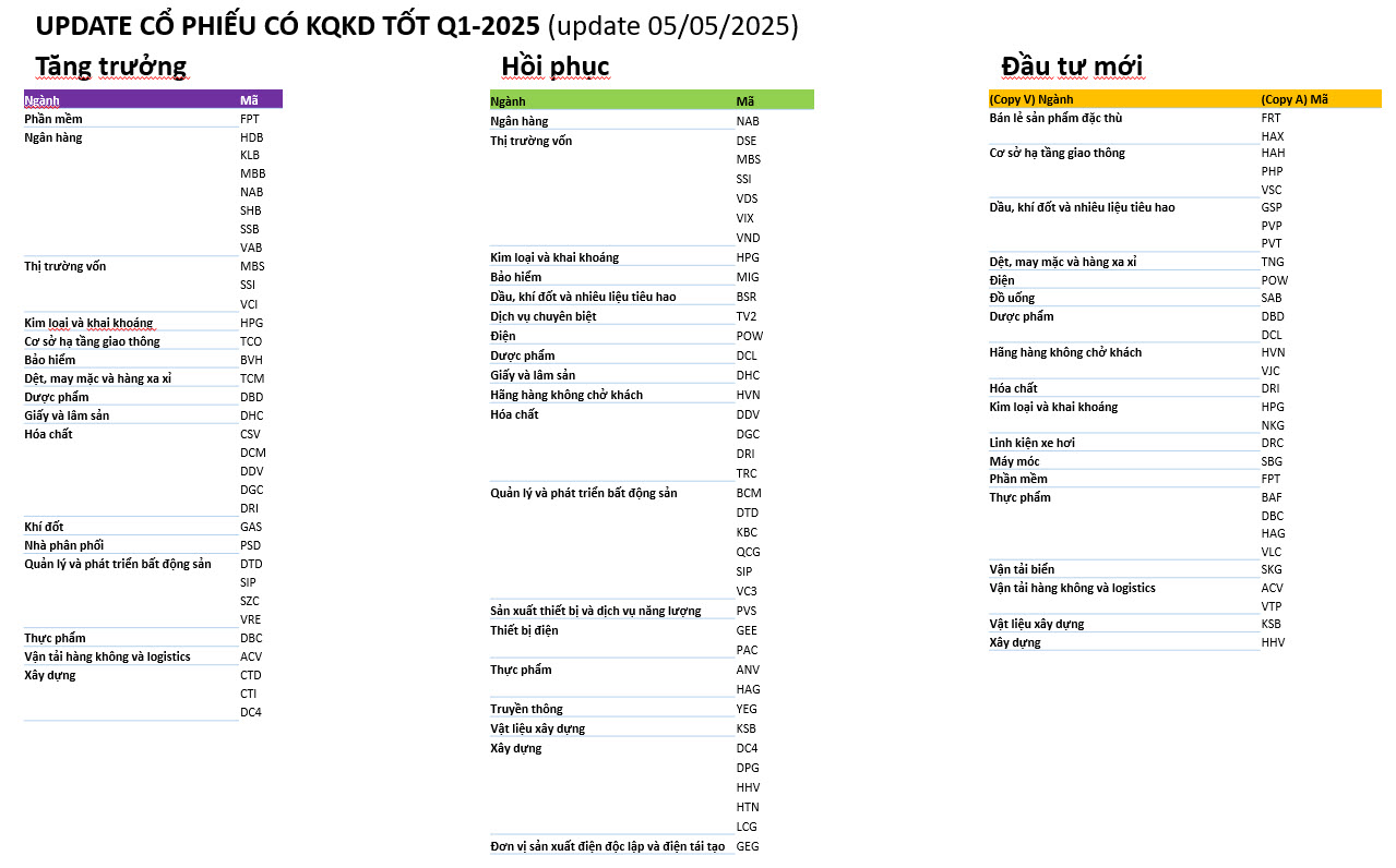 Update ngày 5/5/2025 Nhóm Tăng Trưởng Nhóm Hồi Phục Nhóm Đầu Tư mới