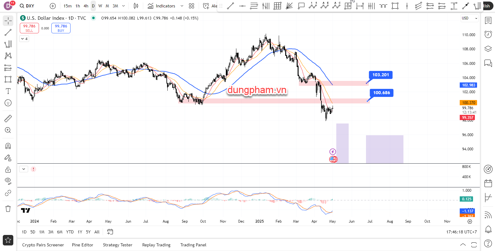 Tuy xu hướng khi mất 100 là xấu, nhưng tôi cho rằng Tháng 5 sẽ có sự phục hồi của DXY, đặc biệt ở nửa cuối tháng 5. Cụ thể:
