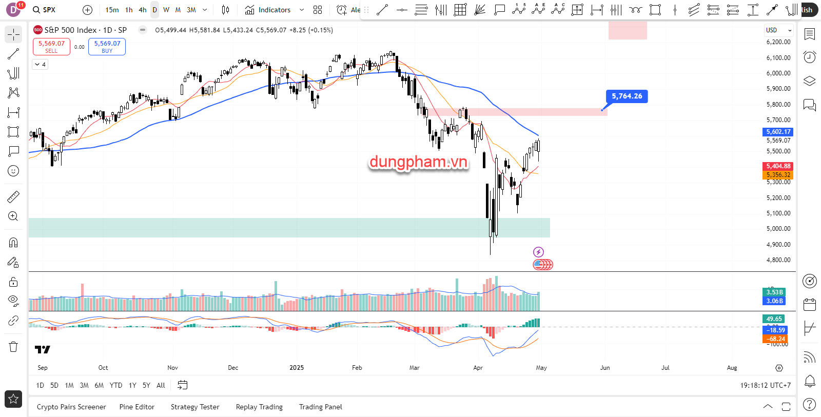 Trong tháng 5, tôi thiên về sự tích cực cho SPX, chúng ta sẽ chờ phản ứng ở khu vực 5,700 và đỉnh cũ 6,000.
