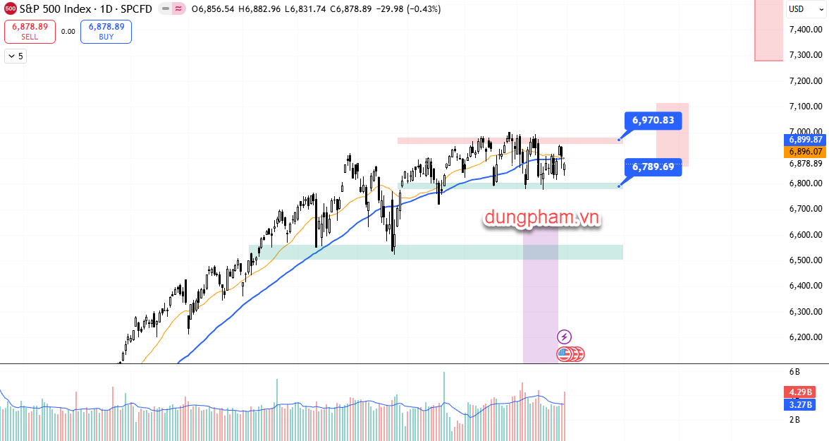 - 4 tháng nay, từ tháng 11/2025, SPX đi trong biên 6800-7000. Xu hướng này tạm thời chưa thấy sẽ thay đổi – theo hướng break lên hoặc rơi xuống.