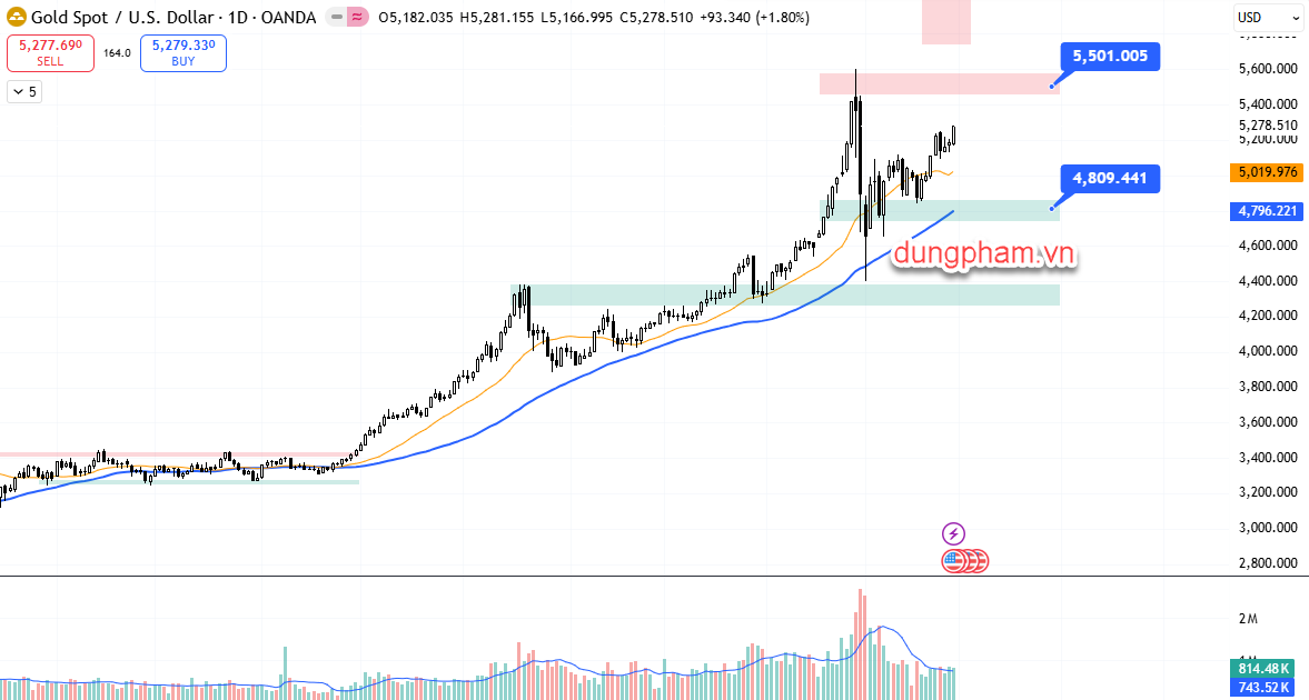 - Trong tháng 3, tôi cho rằng Vàng có xu hướng tăng cao hơn ở nửa đầu tháng, thấp hơn ở nửa cuối tháng. Cụ thể, Vàng có thể quay lại test đỉnh $5500 tuần đầu tháng 3 trước khi suy giảm và đi ngang sau đó. Hỗ trợ trước mắt $4800 và $4300.