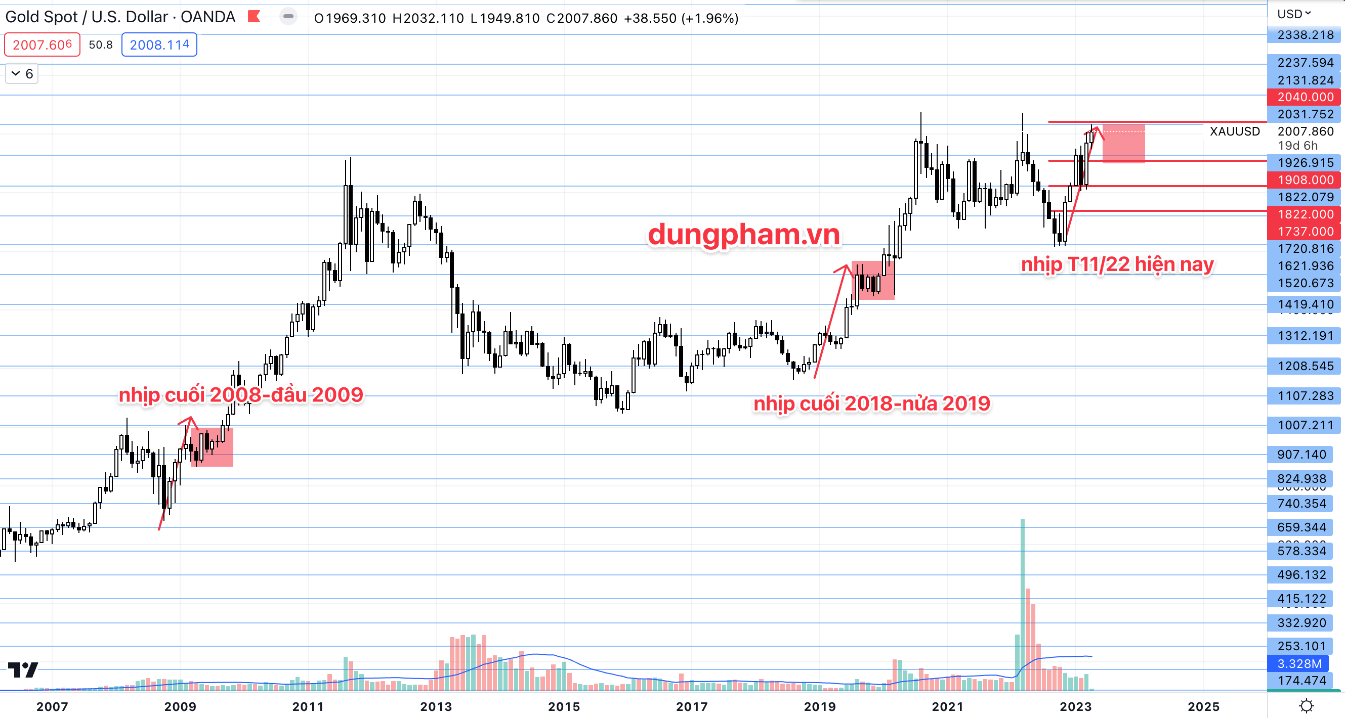 Trong đó về biên độ, nhịp tăng trung hạn vừa rồi từ $1615 lên $2032 T11/2022-T4/2023 cũng tương đồng về biên độ với các đoạn tăng đầu 2019 và đầu 2009.