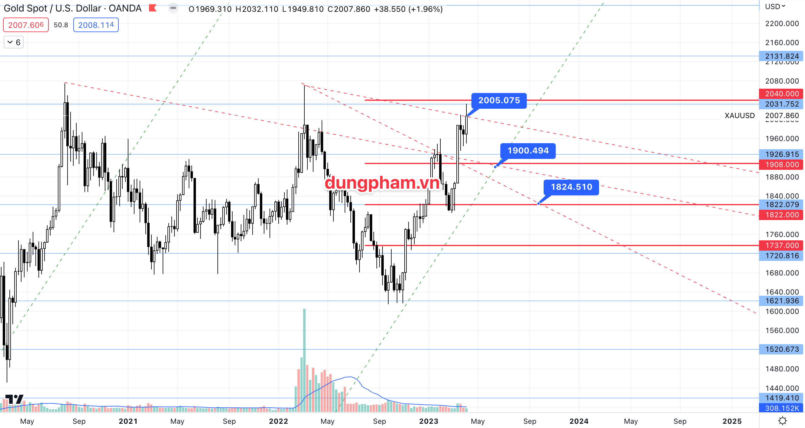 Ở thời điểm hiện tại (9/4/2023), Vàng đóng Tuần không vượt qua được đường kẻ đỏ ở $2005. Ngay cả thời điểm vàng lên $2032, tôi cũng không tin đường line đỏ này bị phá dễ dàng như thế, và kết Tuần thì đúng thật.