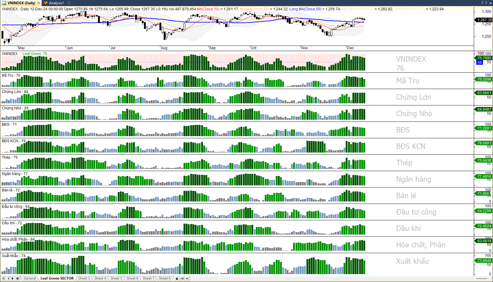 Phiên hôm qua 12/12: VNI đóng cửa 1267đ -1.5đ -0.1%. Sự hứng khởi ở phiên sáng và một số CP có dấu hiệu phát động đã không được hưởng ứng ở phiên chiều. Kết quả kém là đương nhiên. VN30 phát động không thành công, đóng nến quanh tham chiếu. Dòng tiền dương duy trì ở mức cao 76 (phiên trước 80) nhưng có dấu hiệu suy giảm nhẹ