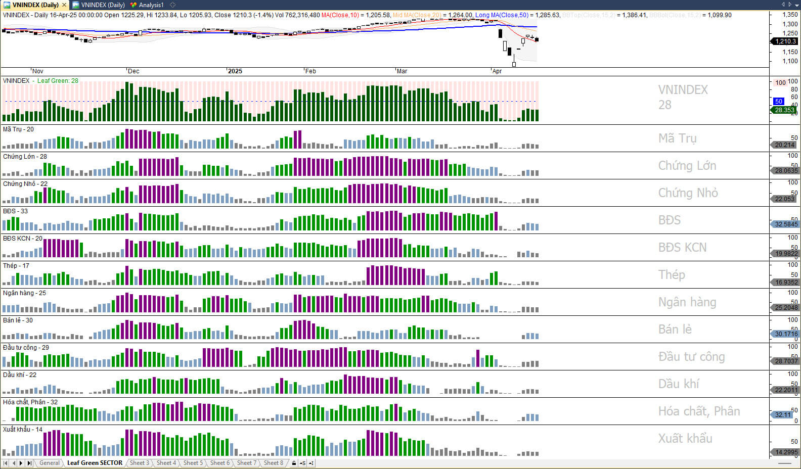 - Phiên gần nhất 15/04: VNI đóng cửa 1227đ -13.6đ -1.1%. TT có đà bán từ đầu phiên sáng, dù nhú lên tí sau 10h nhưng nhanh chóng bị bán lại. Kết phiên ở 1/3 thân nến dưới. Điều này cho thấy có áp lực chốt lời nhất định trên thị trường sau giai đoạn tăng mạnh từ đáy. VN30 khá hơn khi lực bán không mạnh, vol thấp hơn hôm trước. Dòng tiền dương 29 (phiên trước 31), xu hướng giảm.
