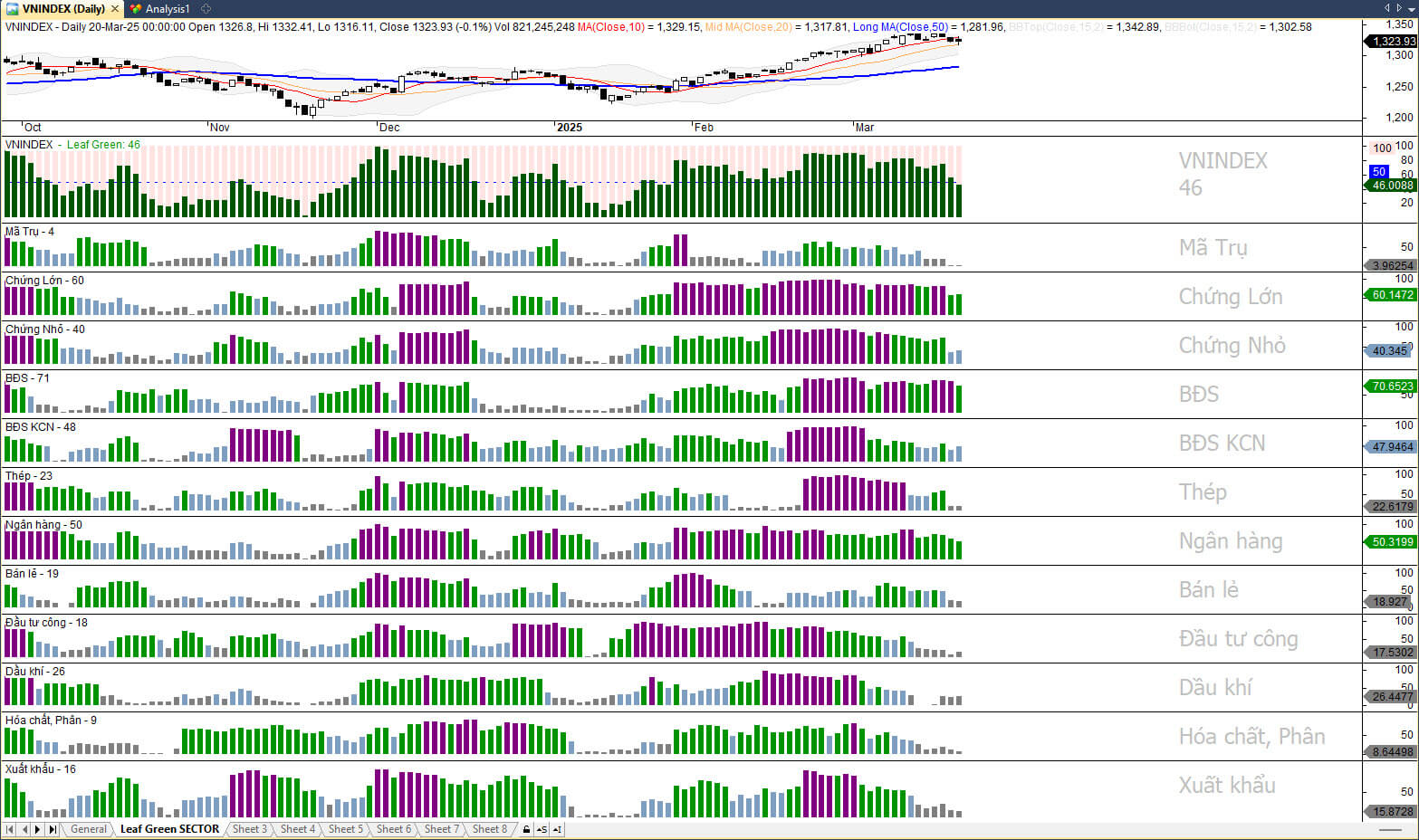 - Phiên gần nhất 20/3: VNI đóng cửa 1323đ -0.7đ -0.0%. Tuy đóng cửa ở tham chiếu nhưng biên độ H L khá lớn, khoảng 16 điểm và là điển hình của phiên đáo hạn phái sinh khi sáng sẽ có giá tốt nhất trong ngày trước khi đánh nhau dữ dội vào phiên chiều. Tuy đóng cửa không vượt được ma10D nhưng VNI đã có phiên test ma20D khá thành công. VN30 bị bán mạnh hơn VNI với đà bàn của FPT. Hiện đã về ma20D nhưng vol lớn. Dòng tiền dương 46 (phiên trước 56), tín hiệu suy yếu