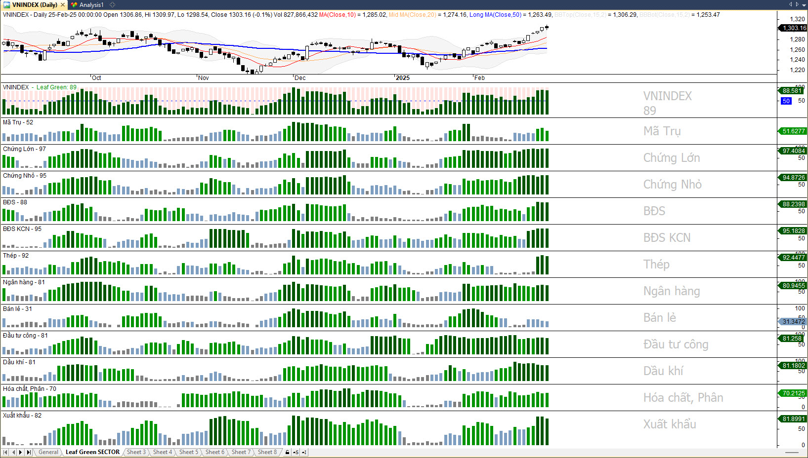- Phiên 25/2: VNI đóng cửa 1303đ -1.4đ -0.1%. VNI có phiên vol lớn, thể hiện sự chốt hàng tại đỉnh 1300 là có thật. Diễn biến trong phiên vẫn như các phiên gần đây khi áp lực gia tăng ở đầu giờ chiều khi hàng về, Low ở quanh 2h-2h15 rồi kéo lên. Tây mua lại sau khi ép bán ở low. VN30 cũng hướng đến vùng cản mạnh 1360, tương đương 1300 của VNI. Dòng tiền dương 89 (phiên trước 90), dòng tiền mạnh. Với nhịp kéo cuối phiên thì đây là một phiên rũ hàng tốt chứ không phải phân phối.