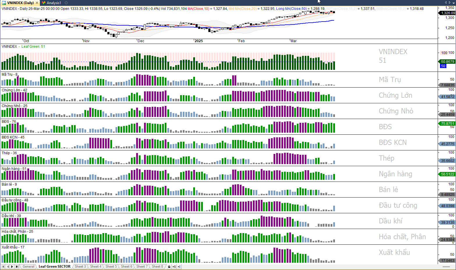 - Phiên gần nhất 25/3: VNI đóng cửa 1331đ +1.6đ +0.1%. Tuy là một phiên tăng điểm nhưng biến động trong phiên không cho thấy sự mạnh mẽ của các CP dẫn dắt. TT mở gap đầu phiên sau sự hưng phấn cuối phiên hôm trước và đêm CK Mỹ khởi sắc. Đà tăng duy trì đến 1h50 chiều trước khi bị bán mạnh tạo Low, lấp gap chỉ trong 30p rồi kéo lại ở cuối phiên. VN30 có một phiên bán vol thấp ở gần đỉnh, chưa quyết liệt lên. Dòng tiền dương 46 (phiên trước 46), 50-50